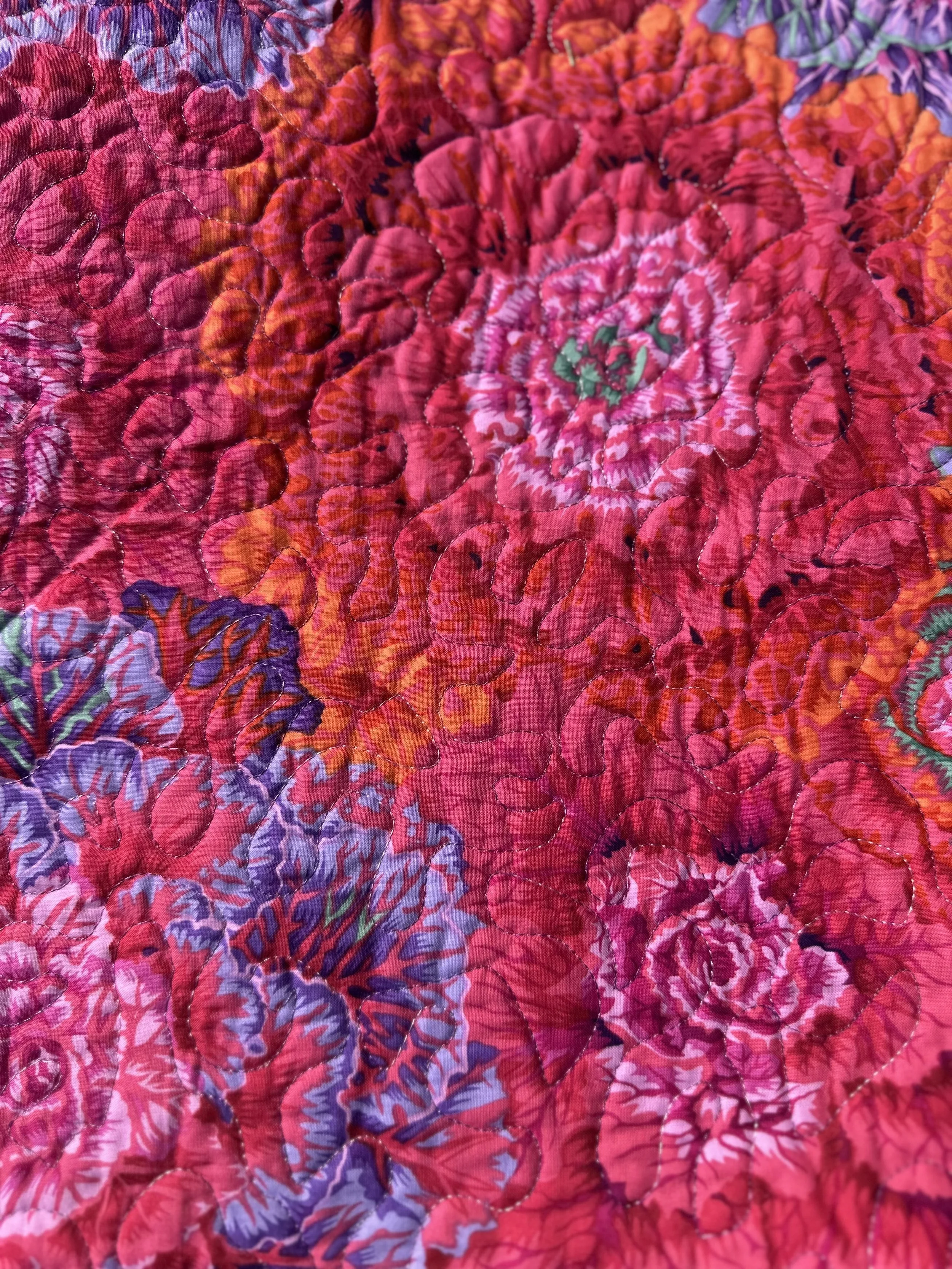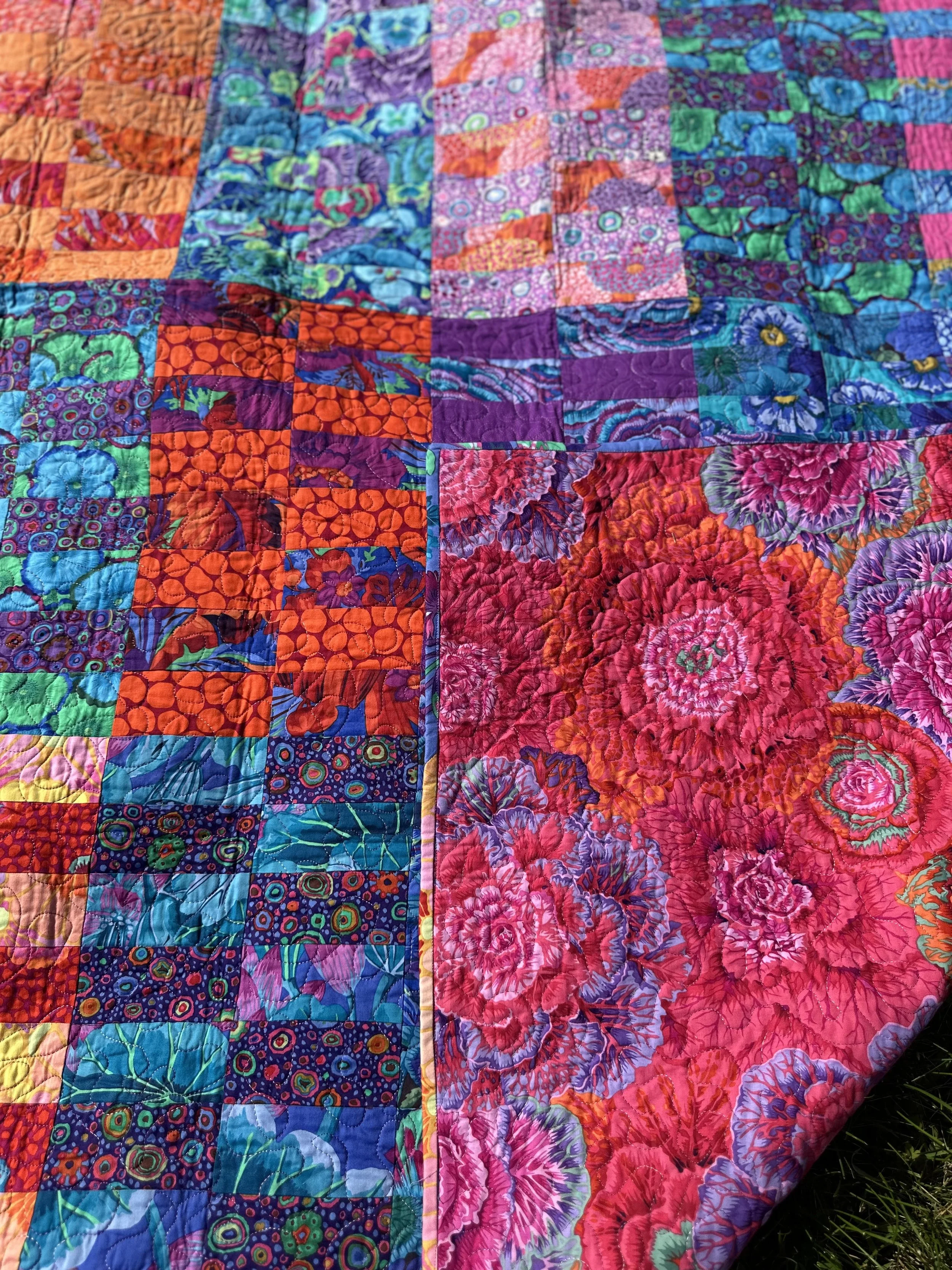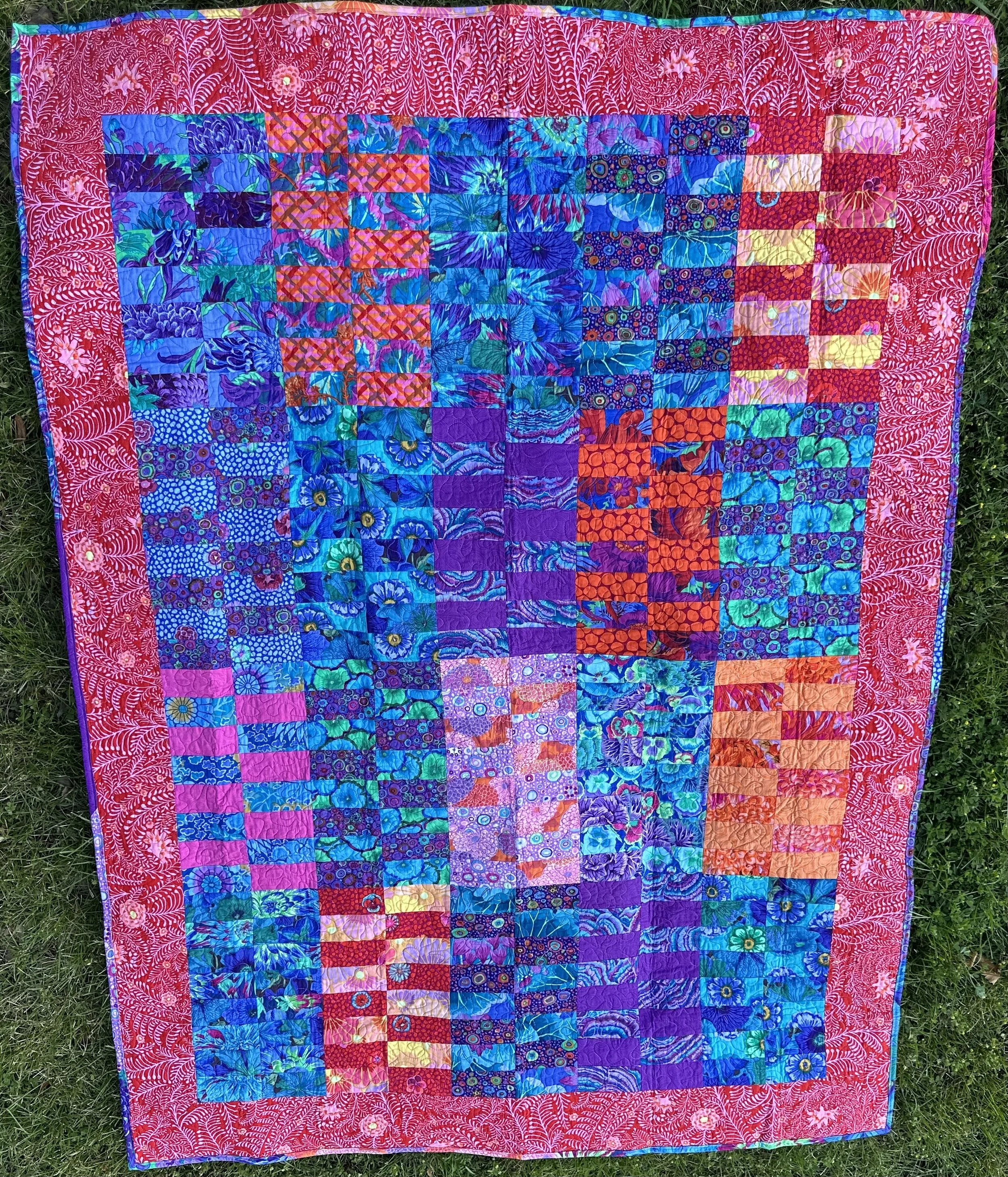 Kaffe Fassett’s bright florals create beautiful pairs in the blocks featured in this quilt. The scrappy binding makes for a fun finished edge. The quilting is done with a free motion stippling technique. This quilt measures 54” x 71”