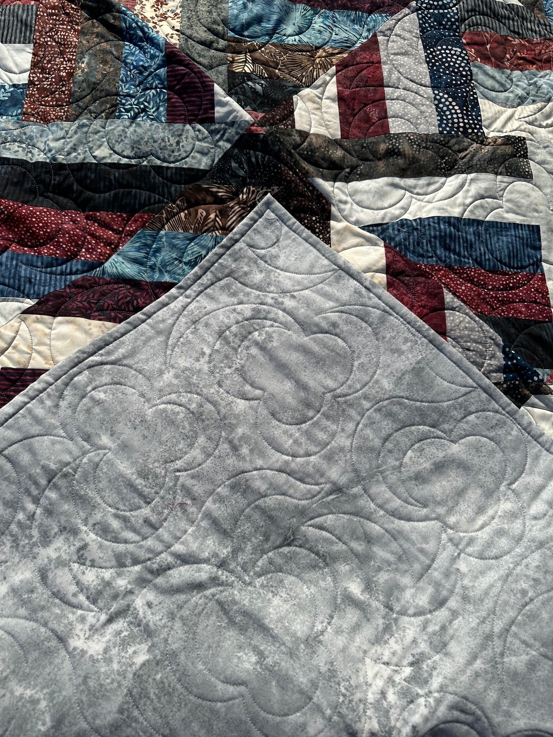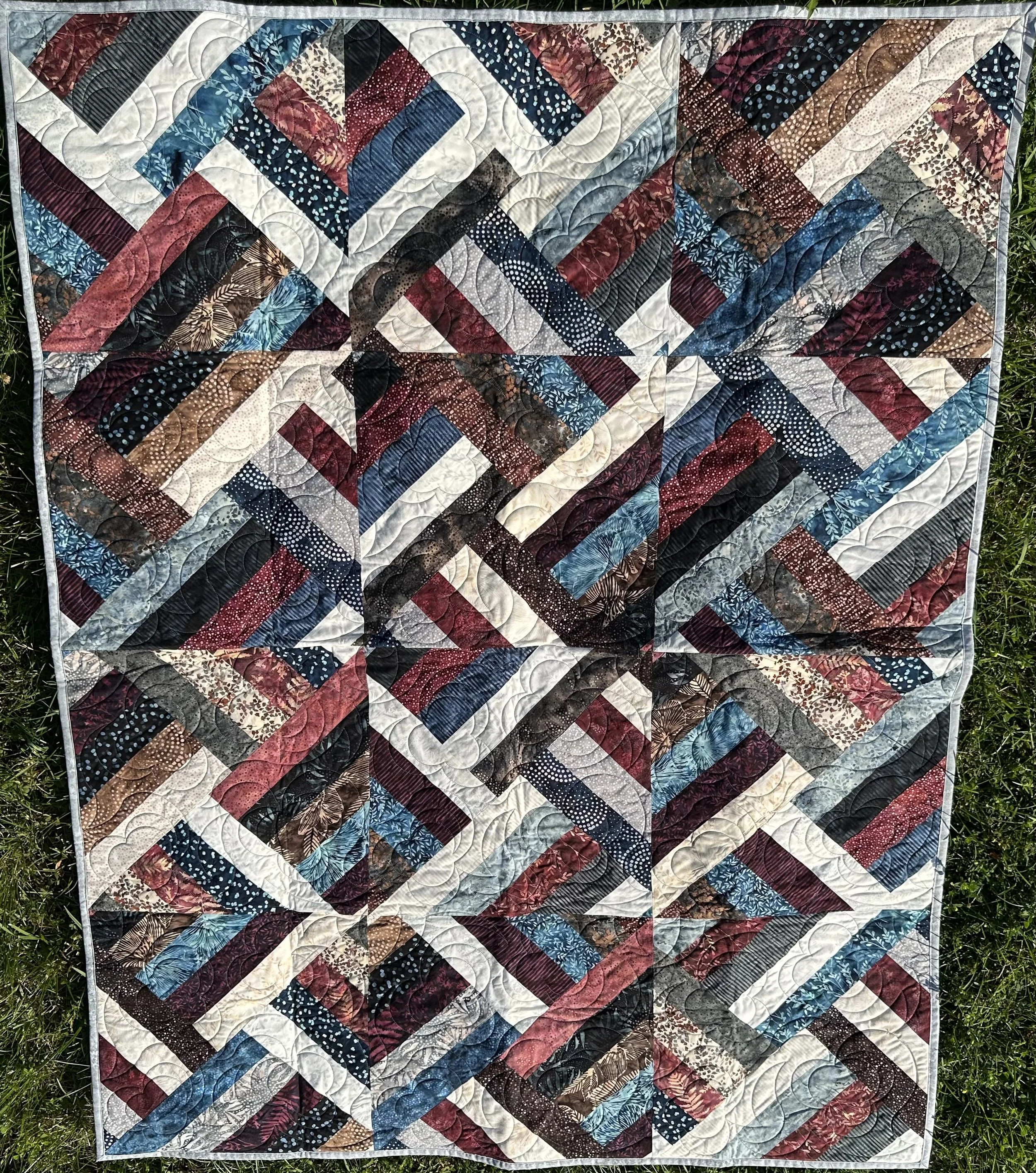 Neutrals mixed in with blues and burgundy batiks come together in strips going in different directions in this quilt. A cotton puff quilting motif may be just what they were searching for. This quilt measures 45” x 58”.